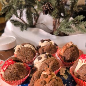 • Using a small ice cream scoop, portion the dough into 14 balls. Place onto the prepared baking sheet. Lightly flatten each scoop.