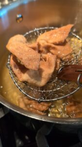 Add enough oil in pot to deep fry. Heat oil to 400℉ and fry 4 to 5 at a time until golden. Do not crowd pot.