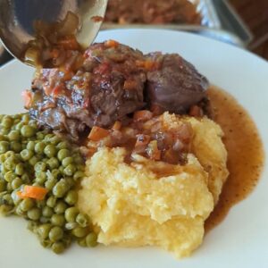 Keyword bay leaves, beef, carrots, celery, cherry tomatoes, crushed tomatoes, herbs, mashed potatoes, onions, osso buco, polenta, rosemary, thyme, veal, white wine
