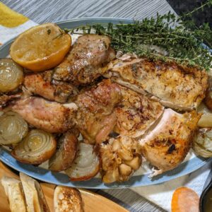 • Remove the pan from the oven and place on a trivet. Be careful as the pan is very hot. Carefully drizzle a tbsp of oil on the pan. Be careful that it doesn’t splatter. Arrange the vegetables (except potatoes) and herbs on the pan, making a bed for the chicken. Lay the flattened chicken on top, breast side up. If using the potatoes, arrange them around the chicken. Drizzle another tbsp of oil on top of the chicken and rub on the skin. Drizzle a tbsp of oil on the garlic to fill in the crevices.